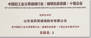 山東藥玻被評(píng)為2019年度中國(guó)輕工業(yè)日用玻璃行業(yè)(玻璃包裝容器)十強(qiáng)企業(yè) 第3名